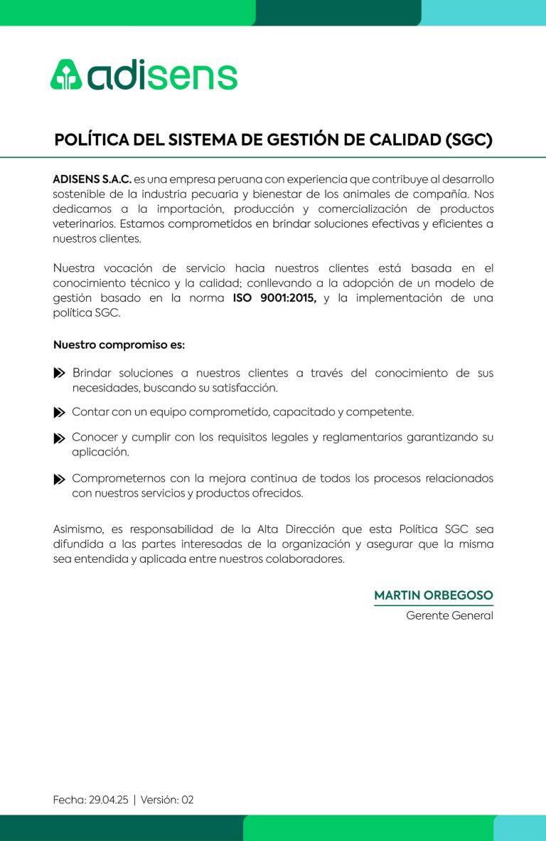 Adisens es una empresa con más de 24 años de experiencia acompañando el crecimiento de la industria pecuaria, dedicada a la importación, comercialización y desarrollo de productos para la sanidad y nutrición de animales de producción, y de mascotas; brindando soluciones eficientes y sostenibles que promueven el bienestar animal en beneficio de nuestra sociedad.